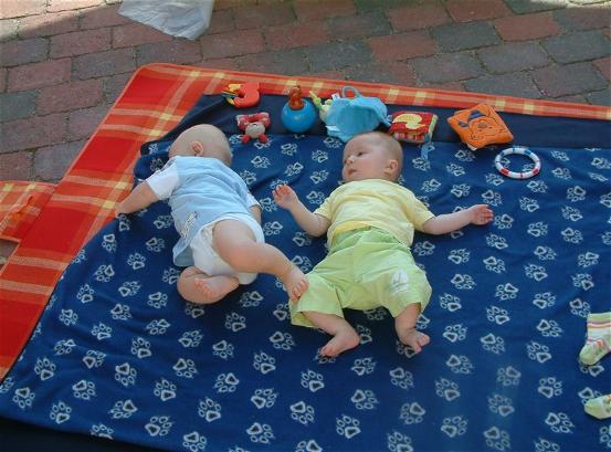 Nele und ihre Mama kamen als erstes. Ich hab die Ankunft aber ein bißchen verschlafen. Aber auch Nele hat sich noch im Kinderwagen ausgeruht. Kein Wunder bei der Hitze. Ich war dann aber auch schon bald wieder wach und so konnten Nele, Leonard und ich zusammen spielen. Unsere Mamis haben in der Zwischenzeit Kaffee getrunken und natürlich ein bißchen gequatscht.