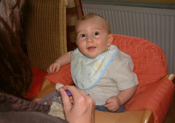 Wieder zurück hab ich ersteinmal meinen Brei bekommen. Ich hatte schon ganz fest Hunger. Mama hat mir heute ein Keksi in den Brei gedrückt, das war vielleicht lecker. Danach war ich noch mit Oma und Opa im Garten. Aber es war recht windig und so bin ich mit Mama wieder rein. Hoffentlich wird das Wetter wieder besser, dass wir noch etwas unternehmen können.