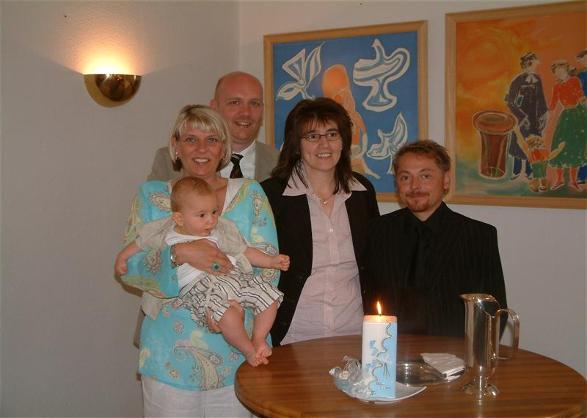 Ich hab jede Menge zu Schauen gehabt und so wurde mir auch nicht langweilig. Sven-Leon durfte mein Taufwasser einschütten. Das hat er richtig toll gemacht. Papi hat mich dann gehalten und dann wurde ich auf den Namen Mika Karl Hennig getauft. Danach hat Tanja noch ein schönes Lied für mich gesungen. Dann war aber auch Zeit dass Schluß war, ich war doch recht müde.