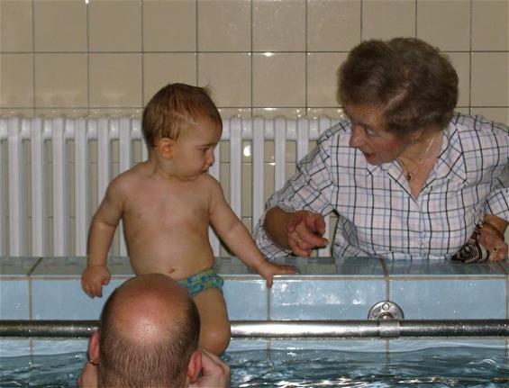 Nachdem ich noch etwas gespielt hab hab ich mich aber noch etwas ausgeruht da wir noch gleich zum Babyschwimmen wollten. Ich bin dann aber so tief eingeschlafen dass Mama mich wach machen mußte. Ich hab schnell noch gegessen und dann sind wir los. Mein Freund Jannick war auch schon da, heute in Begleitung seines Papas und seiner Oma. Seine Mama ist nämlich ganz toll erkältet und da sie uns niocht anstecken wollte ist sie lieber zuhause geblieben. Schade eigentlich denn morgen wollten wir die drei besuchen aber Mama hat gesagt dass es besser ist wir verschieben das Treffen. Naj ich bin ja auch grad erst wieder fit. Wir durfte heute wieder von der Stange hopsen. Papa hat mich dann immer aufgefangen. Danach haben wir wieder gesungen. Ich hab mal wieder mit Lena richtig Gas gegeben. Wir beide sind richtige Wasserratten. Unsere Schwimmlehrerin Edeltraud ist auch immer so lieb, ich hab sie dafür die ganze Zeit angehimmelt, hihi...die mag ich ganz toll.