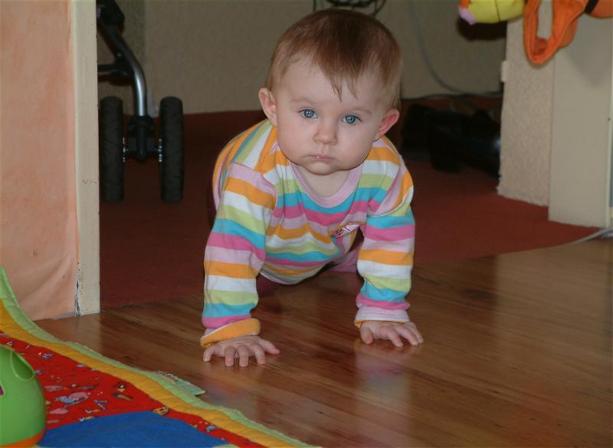 Nachdem wir zwei gefrühstückt hatten haben wir uns auf meine Decke gelegt und zusammen gespielt. Mama hat mir immer Türmchen aufgestellt und ich hab sie ganz schnell wieder umgeschmissen. Ich komme nämlich jetzt schon vorwärts. Ich bin ja auch schon acht Monate. Jetzt kann ich Mama auch immer hinterher robben wenn sie zu weit weg geht. Aber es ist ganz schön anstrengend. Mama hat mich dann nach oben in mein Bett gebracht. Schließlich muß ich ja wieder Kräfte sammeln um noch besser zu robben.