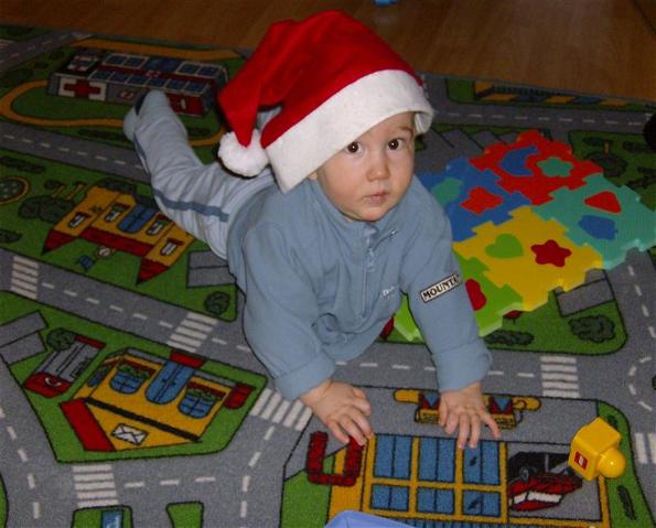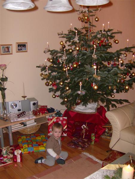 Nach dem Essen sind wir drei dann zu Oma und Opa gefahren. Da hab ich mit meinem neuen Frosch gespielt. Ich bin auch wieder ganz wild durch die Gegend gekrabbelt. Ui ich kann das jetzt schon richtig gut. Von dem vielen Spielen bin ich aber ganz toll müde geworden und so hat Mama mich ins Bett gebracht. Ich hab mich richitg gut ausgeruht, denn gleich kommt ja das Christkind. Wieder wach konnte ich es schon kaum noch erwarten ins Wohnzimmer zu kommen. Da war ein schöner Christbaum mit ganz vielne Kerzen. Wir haben zusammen gesungen und später durfte ich mit Opa die Kerzen auspusten. Dann ging es los, ich kann euch sagen, ich hab tolle Sachen bekommen.....das kommt daher dass ich soooo toll lieb bin, oder? Hihi naja meistens jedenfalls. Ich hab auch gleich mit meinen neuen Sachen gespielt. Da war ein ganz toller Holzelefnat zum ZIehen dabei, dann hab ich noch ein Auto bekommen und noch einiges zum Anziehen.