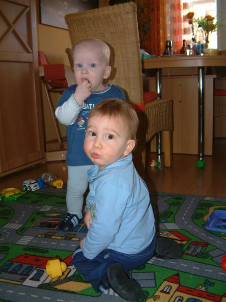 Nachdem ich wach wurde war Leon noch da und wir konnten ein bißchen zusammen spielen. Er hat mir auch gezeigt wie toll er schon laufen kann. Aber ich trau mich noch nicht so recht. Lieber noch an Mamas Hand oder irgendwo an den Möbel lang. Aber ich werde weiter üben. Leon wird mich dabei unterstützen :-)