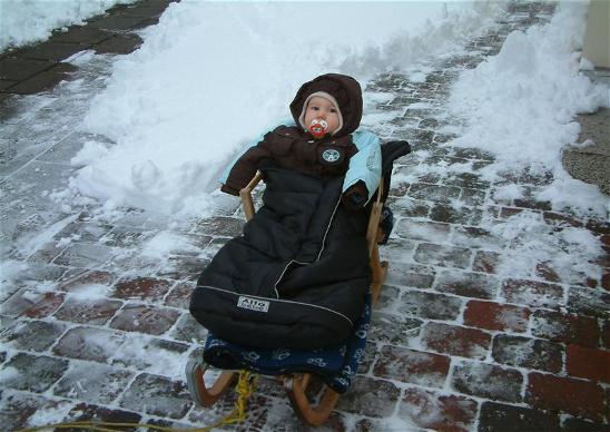 Nachdem die vier weg waren hat Mama mich ins Bett gebracht denn ich war ziemlich ko. Ich hab dann fast zwei Stunden geschlafen. Danach gab es ein leckeres Mittagessen und noch etwas Obst hinterher. Da Papa noch einiges zu tun hatte bin ich mit Mama und Oma noch ein wenig an die frische Luft. Wir haben natürlich meinen tollen Schlitten mitgenommen. Eine Zeit lang war auch alles ok aber dann hatte ich keine Lust mehr irgendwas zwickte und ich fühlte mich gar nicht wohl. Der Wind wurde auch immer stärker und so beschlossen wir wieder nach Hause zu fahren. Naja immerhin waren wir noch an der frischen Luft. Wieder zurück bin ich noch zu Oma zum Spielen und anschließend hab ich mich mit Mama noch ein wenig ins Bett gelegt. Papa mußte noch ein paar Telefonate führen und so haben wir es uns oben gemütlich gemacht. Mh das war schön.