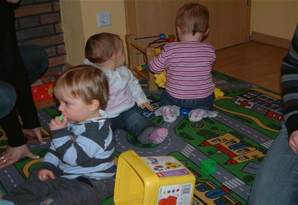 Da wir ja nachmittag weg wollten durfte ich vormittag noch ein wenig zu Oma um zu spielen. Oma hat wieder tolle neue Spielsachen für mich geholt. Wobei ich im Moment lieber stehe und mich irgendwo entlanghangle. Das macht viel mehr Spaß. Wieder zurück hat Mama mich ins Bett gebracht damit ich fit zum Spielen bin. Ich hab auch richitg lang geschlafen und nachdem ich mein Mittagessen bekommen hab sind wir los um Lucia zu besuchen. Leon und seine Eltern waren auch schon da und während wir drei gespielt haben durften unsere Eltern essen und sich unterhalten. Wir haben natürlich auch ein bißchen mitgenascht allerdings nur Brot, denn Chilli ist wohl noch nichts für uns..Aber leider war die Zeit bald rum und wir sind wieder nachhause gefahren. Naja wir haben halt alle unsere Schlafenszeiten und wir waren alle schon recht toll müde.