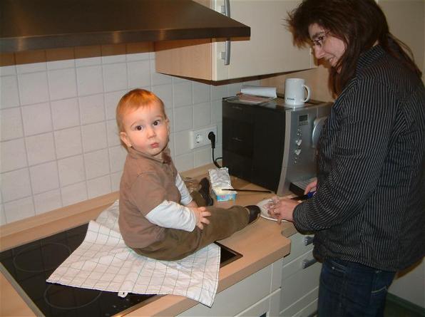 Mama hat dann für mich gekocht. Endlich wieder etwas selbstgemachtes. Oma hat zwar auch ein paar mal für mich gekocht aber ich mußte auch ein zweimal etwas aus dem Gläschen essen. Nicht dass das nicht schmeckt aber wenn Mama oder Oma kochen ist mir das schon lieber. Ich hab auch ein bißchen zugeschaut und dabei ein wenig in den Schubladen gestöbert, hihi...Mama muß jetzt allles in Sicherheit bringen. Ich hab dann auch schon mal versucht die Treppe hoch zu klettern, ui das klappt auch, nur wieder runter....Papa meint wir wollen morgen ein Treppenschutzgitter kaufen...