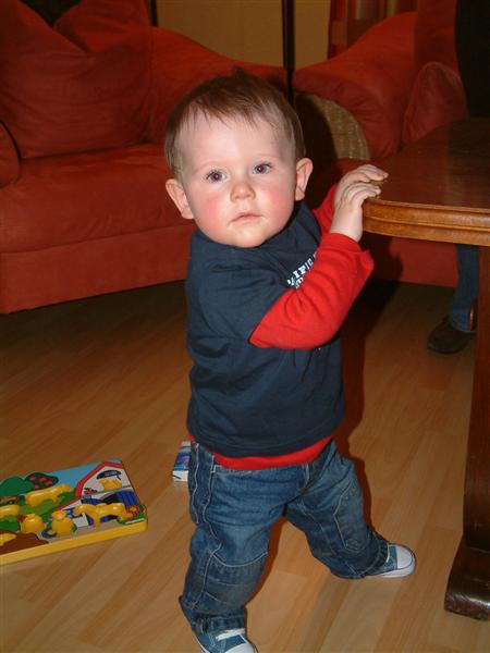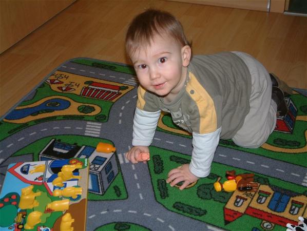 Später sind wir noch einkaufen gefahren. Wir mußten noch Papas Anzug wegbringen zur Bank und Mama mußte noch kurz zum Arzt da sie sich ein wenig am Daumen verletzt hat. Wieder zuhase hab ich mit meinem Bauernhof gespielt. Mittlerweile finde ich schon alle Tiere wenn Mama fragt wo die sind. Und ich versuche nun schon mal mich wieder zu setzten wenn ich mich irgendwo hochgezogen hab, aber ganz klappt es noch nicht. Ich bin halt etwas ängstlich und froh wenn Mama oder Papa in der Nähe sind.