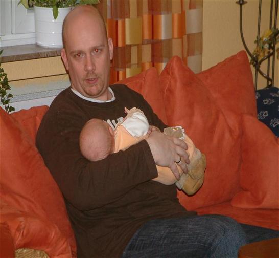 Wieder zurück mußte ich mich erst einmal ausruhen. Papa war auch wieder da und so war die Gelegenheit günstig dass ich mich an Papa kuschle. Vielleicht hab ich ja Glück und ich darf bei ihm auf dem Arm bleiben. Mal schauen wenn ich mich schnell schlafend stelle, vielleicht. Und siehe da es hat geklappt, allerdings mußte ich mich nicht lange schlafend stellen denn es war so gemütlich dass ich tief und fest eingeschlafen bin. Mh das war schön und so haben Papa und ich fast zwei Stunden geschlafen. Danach gab es Mittagessen, nur im Moment mag ich gar nicht gerne essen, außer süße Sachen. Mama schimpft dann aber immer und so esse ich halt doch ein paar Bissen, allerdings bekomme ich dann auch nichts Süßes, mh mal schauen wie ich das anstelle dass das wieder besser klappt. Später hat Mama noch Kuchen für morgen gebacken und ich hab mit Papa gespielt.