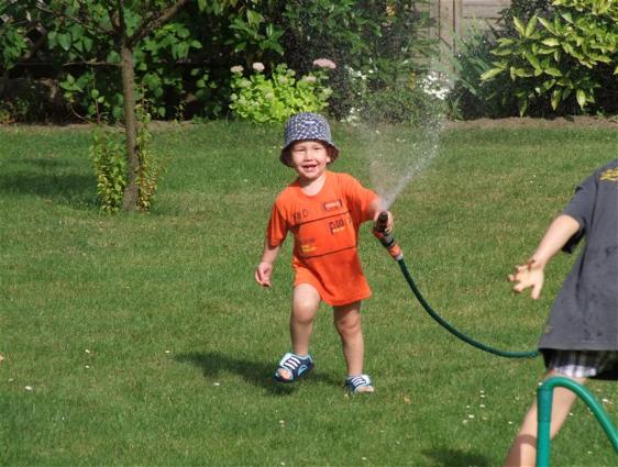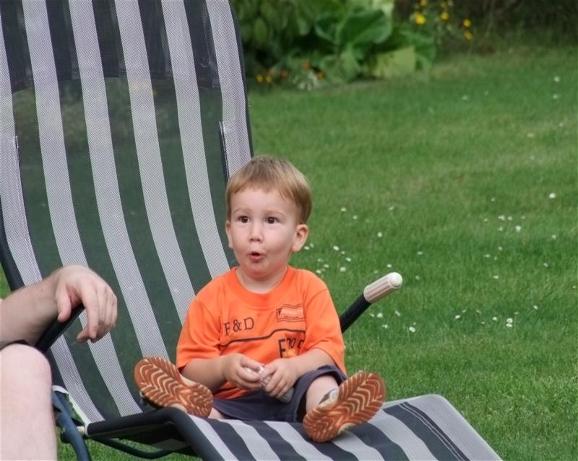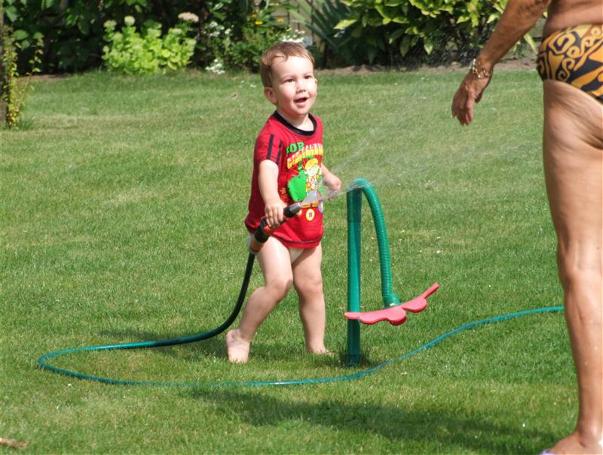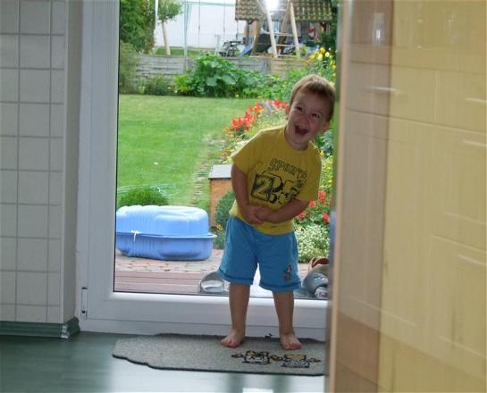 Am Donnertsag war ich wieder rcht früh auf aber da Oma und Opa ja auch schon recht früh wach sind hab ich immer viel Action. Am liebsten wär es mir wenn Oma gar nicht erst frühstücken würde sondern gleich mit mir spielen würde. Aber einer von beiden hat immer Zeit und so schau ich immer erst mit Opa Bücher an und anschließend mal ich mit Oma. Dann werd ich immer schön müde und schlaf immer noch ein wenig. Das Wetter hatte sich auch wieder gut gefangen und so konnte wir wieder in den Garten. Was bin ich froh dass wir so einen schönen Garten haben. Hoffentlich werde wir das in Weinheim auch haben. Mama und Papa wollten sich jetzt bald nach einem Häuschen umschauen. ach dem Mittagessen hab ich ein kleines Schläfchen gemacht damit ich wieder fit wurde. Nachmittag kam Hendrik mich wieder besuchen und wir haben uns wieder eine Wasserschlacht geliefert. Ich war wieder ganz toll naß aber ich hatte riesen Spaß. Später kamen noch Karina, Dirk, Finja, Carla und Hartmut zu Besuch. Da es aber schon recht spät war mußte ich dann ins Bett aber wenigsten konnte ich Finja noch gute Nacht sagen.