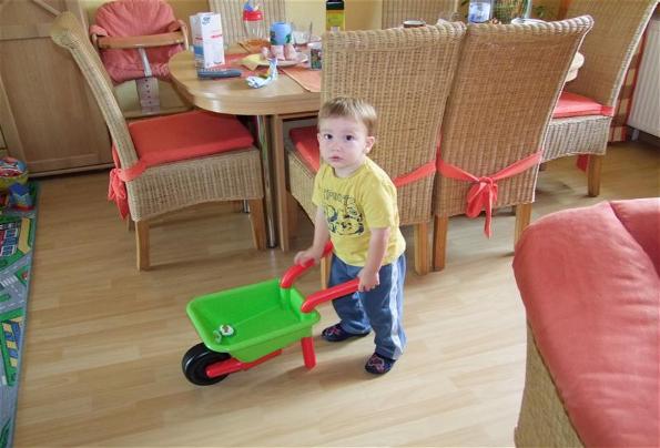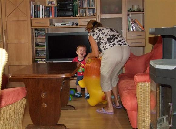 Am Freitag hab ich schon morgens richitg Vollgas gegeben. Oma mußte auf dem Löwen hopsen und ich bin mit dem Laufwagen vor ihr her. Hihi das war ein Spaß und ich war ganz naßgeschwitzt. aber egal. Oma war ganz schön aus der Puste, kein Wunder so wie ich sie herumgescheucht hab. Aber danach konnte ich richitg gut schlafen. Mama hatte mich noch umgezogen da alles naß war und so schlief ich eine Stunde. Danach war ich noch mit Papa draußen unterweg um wieder ein paar Steine für meinen Anhänger einzusammeln. Nach dem Mittagessen und meinem Schläfchen durfte ich Kristof beim Rasen mähen helfen. Ich mußte doch schließlich schauen ob alles richtig ist, hihi. Abends kam noch Oma zu uns um mit uns zu essen. Oma und Opa müssen nämlich morgen leider wieder nachhause und so wollten wir noch einen gemeinsamen Abend verbringen. Ich mußte dann zwar ins Bett aber ich denke die anderen haben sich schon amüsiert.