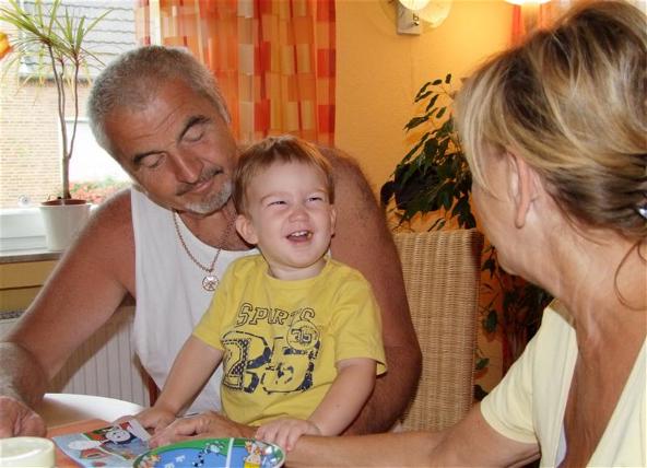 Am nchsten Morgen waren Mama und Papa noch etwas müde, naja scheint wohl länger geworden zu sein. Aber so ist das nun einmal und ich hab schließlich Hunger. Mama ist dann mit mir aufgestanden und sie hat auch lieb mit mir gespielt. Ich hab dann auch ein kleines Vormittagsschläfchen gemacht und danach habne Mama, Papa und ich gut gefrühstückt. Anschließned sind wir raus in den Garten Das Wetter war so gut sodass es kein Problem war. Nach dem Mittagessen war ich richitg toll müde und so hat Mama mich schnell ins Bett gebracht. Ich war aber auch schon aufgeregt denn Oma und opa aus Tirol kommen heute zu besuch. Nachdem ich nicht so lange geschlafen hab, hat sich Mama mit mir noch einmal hingelgt und so konnte ich noch fast eine Stunde schlafen. Anschließned habe ich schon gespannt auf Oma und Opa gewartet. Endlich war es soweit und Papa kam mit den beiden an. Juhu ich hab mich gefreut. Ich hab auch ganz tolle Spielsachen bekommen die ich natürlich gleich ausprobieren mußte. Leider war aber wieder Sonntag und Sonntag muß Papa immer weg und diesmal seh ich ihn eine ganze Woche nicht, denn wir bleiben mit Oma und opa in Duisburg. Puh hoffentlich ist bald Freitag. Nachdem wir noch zusammen mit Oam und Opa gegessen haben und ich mit Mama in der Wanne war mußte ich auch schon ins Bett. Mh ich konnte ganz schlecht einschlafen, denn ich hab Papa schon jetzt ganz schlimm vermisst...wie wird das wohl noch in der Woche werden?....