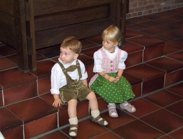 Am Samstag war ein besonderer Tag. Die Hochzeit von Karina und Dirk, die Taufen von Finja und Lisa-Marie und Carla und Hartmut feierten auch noch ihren 40. Hochzeitstag. Mama war morgens noch zum Fönen bei Astrid und ich konnte in der Zwischenzeit mit Papa noch ein bißchen draußen spielen. Danach haben wir zusammen zu Mittag gegessen und anschließend hat Mama mich schnell ins Bett gebracht, denn ich mußte ja pünktlich raus. Aber was soll ich euch sagen, diesaml bin ich so tief eingeschlafen dass Mama mich wecken mußte. Ich mußte ja noch angezogen werden ich wollte doch auch so schick wie Mama und Papa sein. Dann ging es los und wir warteten alle gespannt auf die Braut. Karina kam dann auch und sie war wunderschön. Allerdings kam auch Enely und die war auch total süß. Wir beide haben und dann ein bißchen in der Kirche umgeschaut denn für uns gab es ja erst einmal nichts zum spielen. Aber wir fanden es trotzdem spannend. Danach wurden noch Bilder gemacht und dann ging es zur Feier. Mh schon recht spät ob ich heute aufbleiben darf??? zu früh gefreut, nachdem ich mir mit Frank die Pferde angeschaut hab und ich noch ein wenig spielen durfet haben Mama und Papa mich nach Hause gerbacht. Mh schade aber naja ich bin halt noch klein. Kristof hat dann wieder auf mich geschaut aber ich war ganz toll brav und so hatte er nichts zu tun.