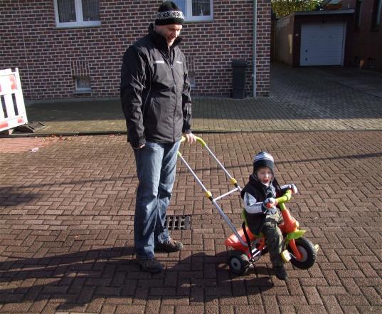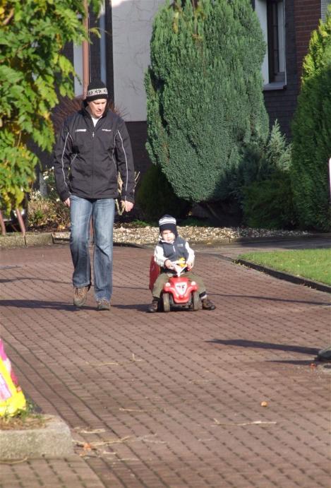 Am Freitag wollte Papa wieder früher Feierabend machen und so hat Mama schnell alles fertig gemacht so dass wir auch pünktlich los konnten. Vorher bin ich mit Mama noch zur Spielegruppe, denn wir wollten ja noch Laternen für nächste Woche basteln. Naja unsere Mamis haben gebastelt, wir haben ein bißchen gemalt aber den Großteil haben unsere Mamis gemacht, so konnten wir schön spielen. Wieder zurück hat Mama noch schnell etwas für mich zu essen gemacht und dann haben wir auf Papa gewartet. Um halb eins konnten wir ihn dann schon abholen und dann ging es zurück. Ich hab fast die ganze Fahrt verschlafen und so kamen wir schon recht früh in Duisbrug an. da das Wetter recht gut war durfte ich mit Papa noch nach draußen. Oma war noch ncit zurück und so hab ich mit Papa ein paar Runden gedreht. Aber da ich immer noch nicht ganz fit bin mußte Papa mein Bobbycar samt Anhänger zurücktragen..und mich auch ein kleines Stück, puh...wieder bei Mama mußte ich erst einmal eine kleine Pause machen und dann hab ich drinnen weitergespielt. Endlich kam dann auch Oma nachhause und ich durfte noch ein bißchen zu ihr. Der Tag war sehr schön aber auch sehr anstrengend und so war ich froh als ich ins Bett konnte.