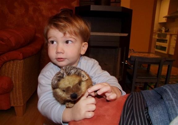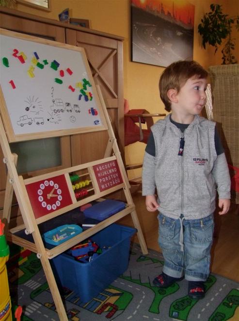 Der Samstag fing gar nicht gut an...gestern hatte ich Durchfall und heute kam nichts raus..was soll denn das jetzt wieder. Ui mein Bauch hat mir ganz toll weh getan und Mama hat mich erst einmal massiert. Das hat gut getan. Nach der MIlch ging es dann auch etwas besser aber ich war ziemlich ko...und so hat Mama sich mit mir auf die Couch gelegt. Dort hat ich dann zwei Stunden geschlafen. Das hat gut getan..aber das Wetter hat ja auch dazu eingeladen..so schlecht wie es war. Nachdem ich wieder wach war konnte ich schön spielen. Mama hat in der Zwischenzeit gekocht und ich hab mit Papa meine neue Tafel ausprobiert. Wir haben gemalt und auf der anderen Seite kann man auch Buchstaben und Zaheln dranmachen...das ist genau das Richtige für mich. Nach dem Essen hab ich noch ein kleines Schläfchen gemacht. Allerdings nicht so lange..aber ich hab ja morgens noch einmal so viel geschlafen und immer kann ich ja auch nicht schlafen, oder?. Später bin ich noch zu Oma um zu Spielen..Oma hatte auch wieder ein neues Auto für mich. Ein Bobbycar in ganz klein, hihi aber das fährt vielleicht schnell..huii was für ein Spaß. Mama und Papa waren ind der Zwischenzeit einkaufen. Ich war froh dass ich nicht mit mußte denn ganz so fit bin ich immer noch nicht. Abends hab ich mit Oma und Opa aus Tirol telefoniert und ich hab den beiden erzählt dass ich den Igel den sie mir geschickt haben ganz toll gerne mag..der ist nämlich ganz tol kuschelig und der muß immer in mein Bett. Abendessen war heute wieder nicht so meins und in die Badewanne wollte ich auch nicht. So hat Papa mich Bettfertig gemacht und ich hab schon um kurz nach sieben geschlafen.