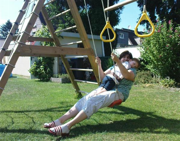 Am Donnerstag kam eine große Überraschung per Post. Papa hatte ein großes Trampolin bestellt und da ich ja so gerne hüpfe konnte es nur für mich sein...wow.. gemeinsam mit Opa und Oma hat Papa es aufgebaut. Ich konnte gar nicht genug bekommen. Leider konnte Papa nicht mit mir hüpfen...aber Opa und ich wir waren ein tolles Team. Mit Mama machte es auch ganz toll Spaß. Oma konnte auch nicht hüpfen...sowas lauter Kranke...aber die kleine Omi hat sich auch mit mir daraufgewagt, wenn auch nur kurz. Lucia kam auch am Freitag und so konnten wir beide es zusammen testen. das war ein Spaß. Wir beide sind schon ein super Team. Gemeinsam haben wir dann auch Omas Kuchen endeckt und ein wenig genascht, hihi.... Leider vergingen die zwei Wochen mit Oma und Opa sehr schnell und am Samstag mußten die beiden wieder fahren. Mama und ich haben sie noch zum Bahnhof gefahren. Mama war ganz toll traurig und hat ein bißchen geweint. Oma und Opa fiel es auch sehr schwer von uns wegzufahren...puh ich mußte ganz tapfer sein. Ich hab Oma und Opa noch ganz viele Bussis gegeben und dann mußte die zwei schon einsteigen. Ich hab Mama dann getröstet und ihr gesagt dass sie nicht traurig sein muß denn ich bin ja da...ich glaube das hat ihr ein wenig geholfen. Wieder zuhause waren wir noch eínkaufen. Das Wetter war ganz gut und so konnten wir wieder viel draußen sein. Am Sonntag hab ich erst einmal nach Oma und Opa gesucht, puh die waren ja schon weg...hatte ich vergessen...mh hoffentlich sehen wir uns bald wieder. Am Abend kamen dann noch die Nachbarn zum Grillen. Ich glaube Mama war ganz froh denn so hatte sie ein wenig Ablenkung. Am Sonntag bekamen wir Besuch von Donzelmanns, auch eine willkommene Ablenkung, sowohl für Mama als auch für mich. Ich vermisse Oma und Opa schon ganz schön....