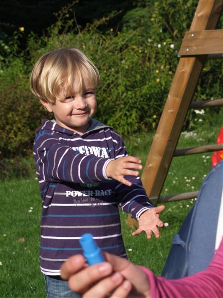 Wir waren fast jeden Tag im Garten denn das Wetter wurde nocheinmal richtig schön. So konnte ich den ganzen tag toben und vorallem hüpfen. Wenn es klappte bekam ich Besuch von Lucia. Das sind dann immer die tollsten Nachmittage. Wri beide können uns richitg austoben und zusammen spielen. Manchmal helfen wir auch meiner Omi bei der Gartenarbeit...da ist immer etwas zu tun..am Liebsten gießen wir natürlich die Blumen. Was auch immer ganz spannend ist, wenn wir mit zu Elli fahren. Am Stall gibt es sooooo viel zu entdecken. Da stehen Traktoren, Maschinen und es sind ganz viele Pferde da...ein aradies für uns Kinder. Wir helfen natürlich auch fleißig mit beim Misten...muß ja auch sein...und manchmal dürfen wir auch auf Elli sitzen. Reiten geht nicht mehr so gut, denn Elli ist schon etwas älter und kann nicht mehr so gut laufen...aber wir sind ja noch leicht und deshalb geht das ab und zu. in der nächsten Woche bekam Papa noch mehr Krankengymnastik...das dauerte immer so drei Stunden. Meistens holen wir ihn ab und ich darf noch Walsmeister trinken...das schmeckt vielleicht gut...fast soooo gut wie Waldmeisterbrause..die essen Lucia und ich am Liebsten..aber das ist ganz sauer..hihi wenn ich dann mit Oma und Opa aus Tirol telefoniere sagt Oma immer, ihhhhii sauer, sauer...und macht ganz lustige Gesichter, hihi...wenigstens kann ich so Oma und Opa ab und zu sehen auch wenn sie so weit weg sind. Ich erzähl den beiden dann immer von meinen Zügen und von den Autos, dass sie auch nicht die Namen vergessen..dennn wenn sie uns wieder besuchen kommen muß das schon sitzen. Am Sonntag hat Mama sich mit ihren Weibsen getroffen. Allerdings ist sie erst nachmittag gefahren, denn Papa kann noch nicht so gut laufen und da Oma auch weg war ist Mama erst nach dem Mittagschlaf los. ich war ganz lieb und hab mit Papa gemalt und gepuzzelt. Später kam dann noch Oma rüber und hat mit mir Zug gespielt. Alles klappte prima. Papa schafft das auch mit Krücken. Ich glaube aber dass er doch sehr froh war als Mama wieder das war. Ich durfte dann noch in die Wanne etwas plantschen und nach einer Gesichte ging es schnell ins Bett.