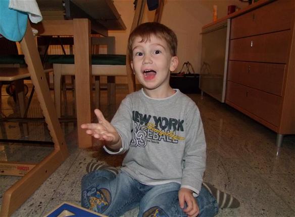 Am Donnerstag sind wir mit dem Bus und dann mit der Bahn in die Stadt gefahren, Papa hatte nämlich das Auto da es Winterreifen bkommen mußte. Nachmittag hatte ich mich mit Georg zum Spielen verabredet. Wir haben zusammen mit seinen Traktoren gespielt, wir haben Futter aufgeladen und es den Kühen gebracht wir haben Holz geliefert und noch vieles mehr. Wir hatten eine Menge Spaß. Georg hat schon echt tolle Sachen. Aber ich kann mich auch nicht beklagen. Es ist halt wieder einmal etwas anderes und mit Georg verstehe ich mich sehr gut. Da macht spielen richtig Spaß. Später haben wir dann Papa abgeholt und noch einen schönen Abend zusammen verbracht. Mama hat lecker gekocht und nach dem Essen hab ich mit Papa noch eine Garage für meine Autos gebaut. Danach war ich in der Wanne und nach einer leckeren Milch und zwei Büchern war dann Schlafenszeit. Da ich etwas erkältet war ist Mama mit mir am Freitag nicht zur Spielgruppe. ich hatte doch recht starken Husten und so haben Mama und ich uns einen gemütlichen Vormittag gemacht. Mama konnte in aller Ruhe die Sachen einpacken, ich hab gemalt und nach dem Mittagessen noch ein wenig geschlafen. Schließlich war es dann Zeit Papa abzuholen und wieder nach Duisburg zu fahren. Die Fahrt ging an diesem Tag ziemlich flott und so hatte ich zuhause noch jede Menge Zeit mit Oma zu spielen. Sie hat auch bei uns zu Abend gegessen und mit mir ein Buch gelesen. das war schön endlich wieder zuhause.