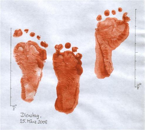 Während Mama dann beim Arzt war, haben Papi und Oma lustige Dinge mit mir gemacht. nachdem sie mich neu gewickelt haben (ich habe heute innerhalb von vier Stunden viermal die Windel bis obenhin zugeka...) hat Papa meine Füße mit Wasserfarben angemalt und dann diese auf ein Blatt Papier gedrückt. Ergebnis war das unten angegebene Bild: