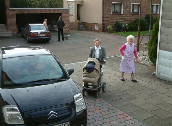 Dann plötzlich klingelt es an der Tür. Ralf und Susanne, die ich bisher noch nicht kennengelernt habe, stehen vor der Tür. Ich bin enttäuscht weil ich gehofft hatte, mit Papa noch rauszugehen. Aber warum zieht mich Mama denn trotzdem an. Papa wird doch wohl nicht gleich zurückkommen und doch noch mit mir gehen. Ich werde in den Wagen gelegt. Hoffnung keimt auf. Dann höre ich das Auto von Papa. Jaaa, wir gehen doch noch. In Windeseile mache ich meine Augen zu und warte. nach kurzer Zeit merke ich, wie mein Wagen aus dem Haus gehoben wird. Dann Bewegung. Ich mache die Augen auf und was sehe ich... Papa ist mit mir unterwegs. Nun kann ich beruhigt einschlafen. Wieder gehe ich mit Papa unsere gewohnte Runde. Auf dem Markt treffen wir noch Johanna, meine Freundin, mit ihren Eltern. Ich erfahre, dass wir wohl morgen zu ihnen gehen werden. Super, also bin ich mit Papa wieder draußen.