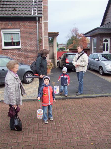 Am Donnerstag war es dann endlich soweit, kurz vor fünf haben wir meinen Kumpel Leo abgeholt. Oma hatte auch Zeit und so sind wir alle zusammen zum Kindergarten maschiert. Dort war schon viel los. Es war auch schon viel Holz aufgestapelt..und Sankt Martin ritt auch auf seinem Pferd. Dann war es soweit wir maschierten los und haben Laternenlieder gesungen...das war aber ein langer Weg und so hat Papa mich zwischendurch getragen. Wieder zurück hatte ich anfangs etwas Angst denn Oma sagte etwas von einem Feuerwerk und ich mag doch so laute Sachen nicht...allerdings meinte sie nicht Feuerwerk sondern einfach Feuer das die Feuerwehr beaufsichtigt damit nichts passiert. Puh dann gefiel es mir sehr gut und ich wollte gar nicht mehr nachhause. Leo und ich sind dann noch zu allen Nachbarn auf unserer Straße und haben dort auch noch gesungen....und wir haben gaaaaaan viele Süßigkeiten bekommen. Da es doch schon recht spät war haben wir unsere Singerei beendet und ich war froh als wir zuhause waren. Mein erster Laternenumzug war trotzdem sehr schön...aber auch sehr anstrengend.